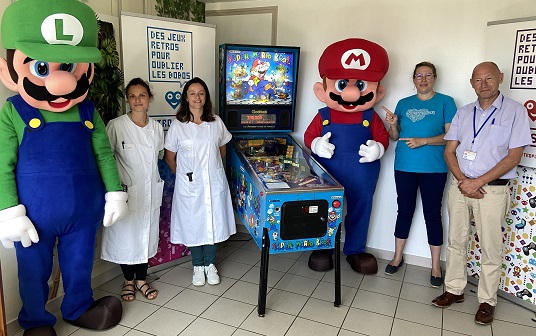En effet, le 12 juillet, ils ont eu la joie d’accueillir, dans leurs locaux, Mario et Luigi de l’association retroplay44. Ces derniers sont venus inaugurer la mise à disposition d’un flipper Super Mario Bros, dans le cadre d’une opération RetroSmile, en présence d’Yves Praud, directeur d’EPSYLAN, du Docteur Maureen Floquet, psychiatre référente et Ophélie Blot, cadre.